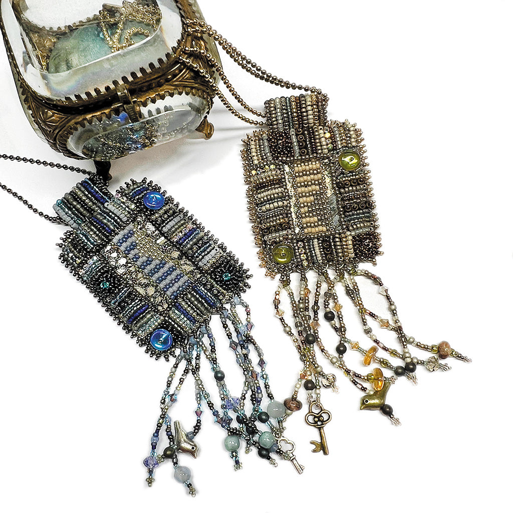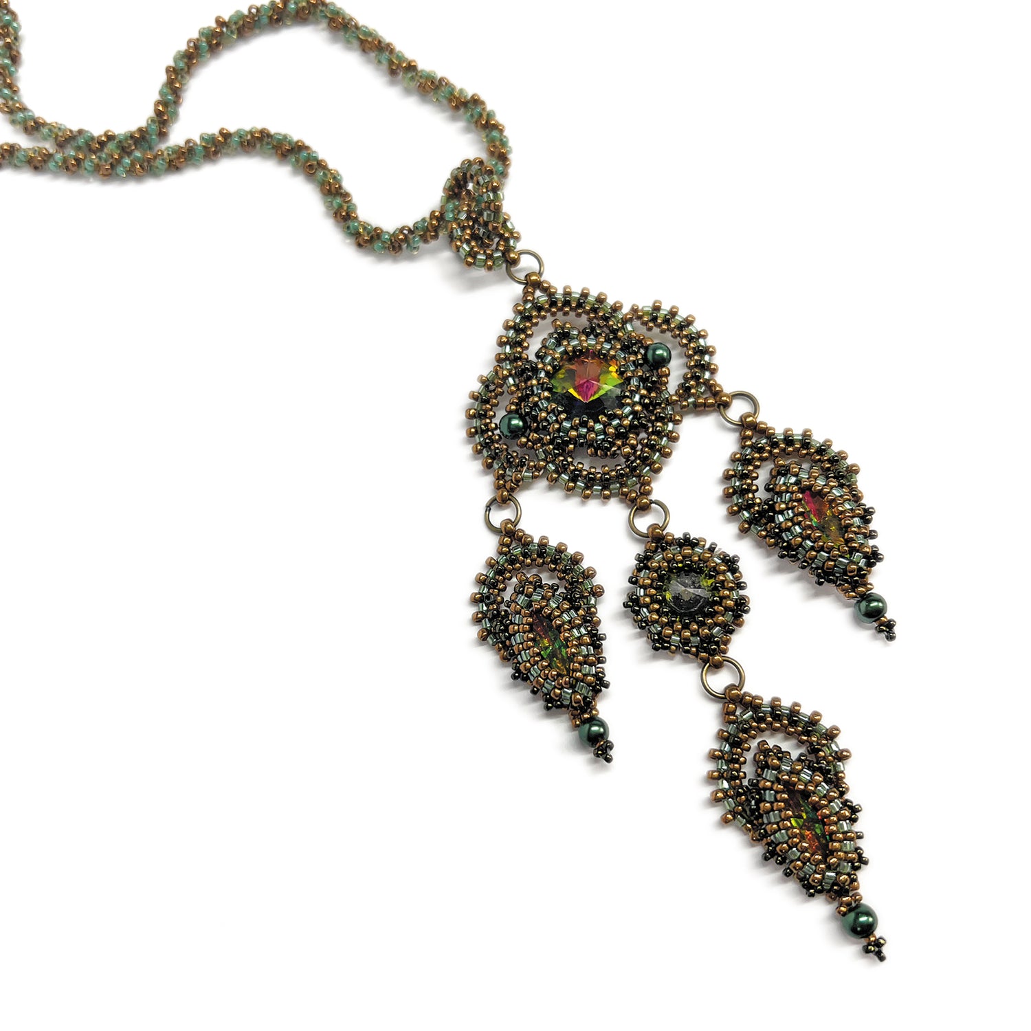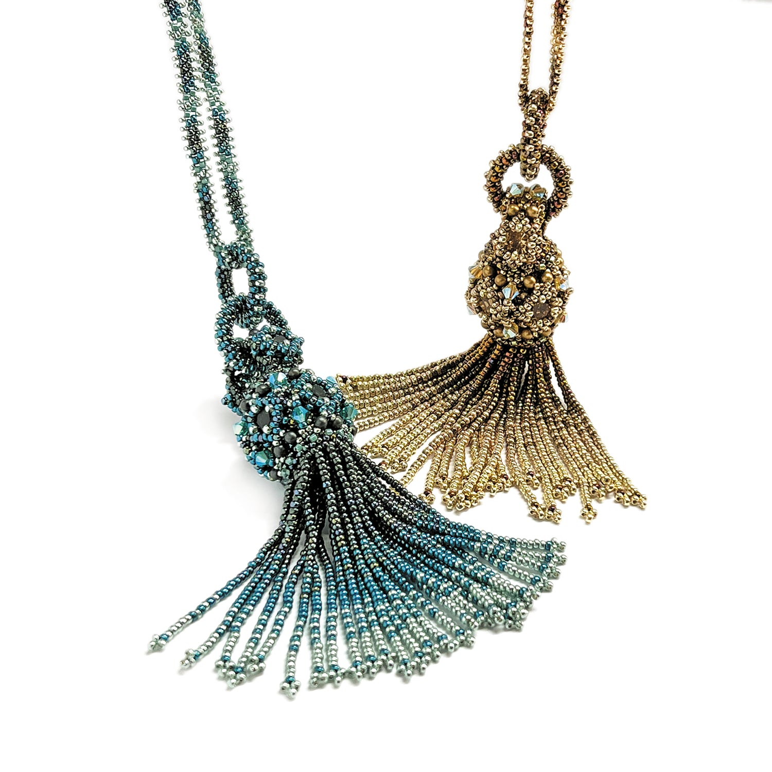 A flowing tassel of metallic seed beads, Molten is a delicious mix of textures. Chatons and crystals are layered over a beaded base and bail, with interlocking rings and a beaded necklace band.Molten is a beautiful statement that takes time to create and perfect for beaders who love to work the details.