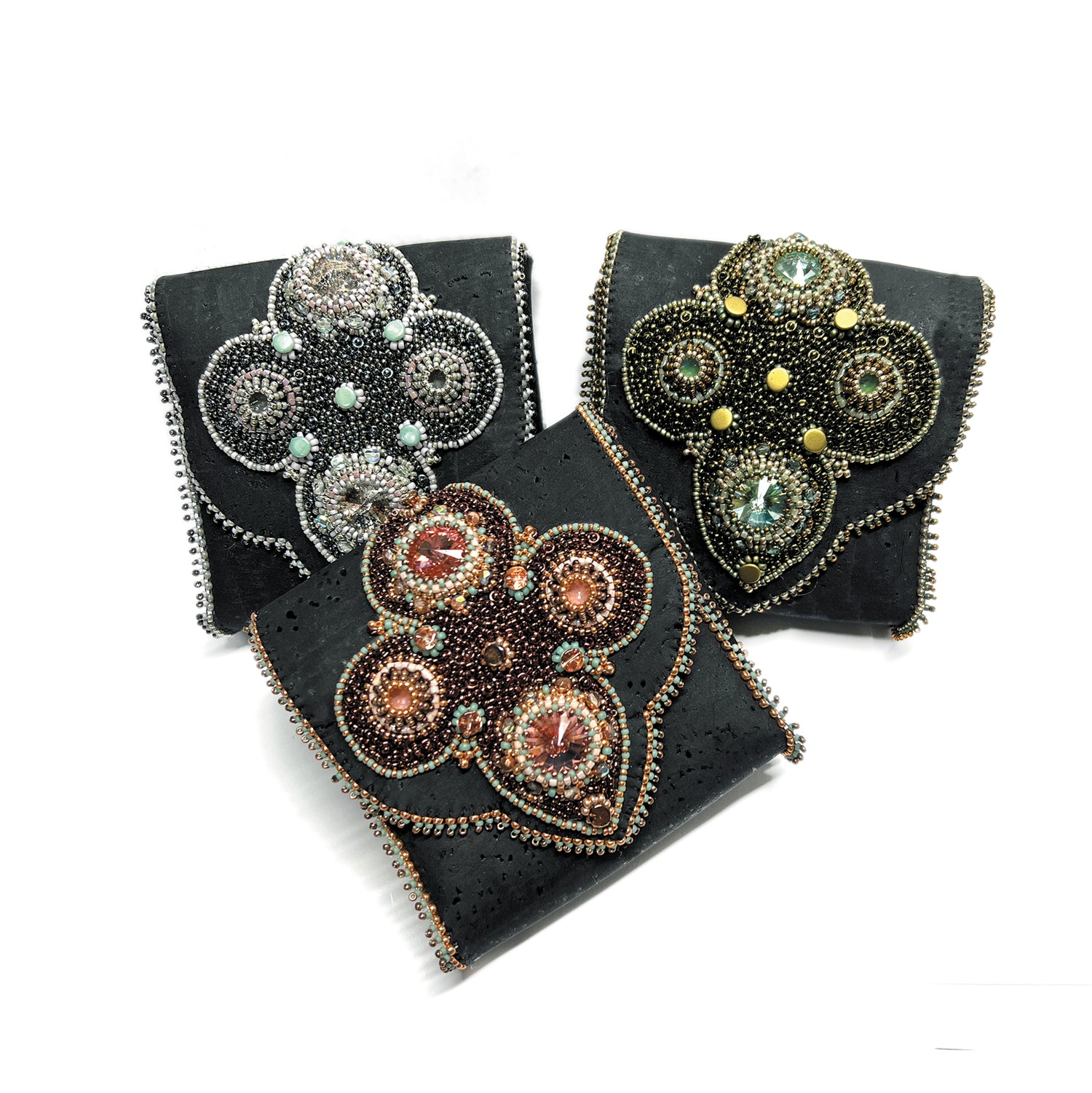 A cleverly constructed bag just the right size for the essentials. It easily holds small scissors, standard reels of thread and features a felt panel to hold needles. The bead embroidery is a lovely mix of direct to fabric beading and simple applied beading. The beading is worked in a mix of seed beads, Delica beads, crystals and Button beads.