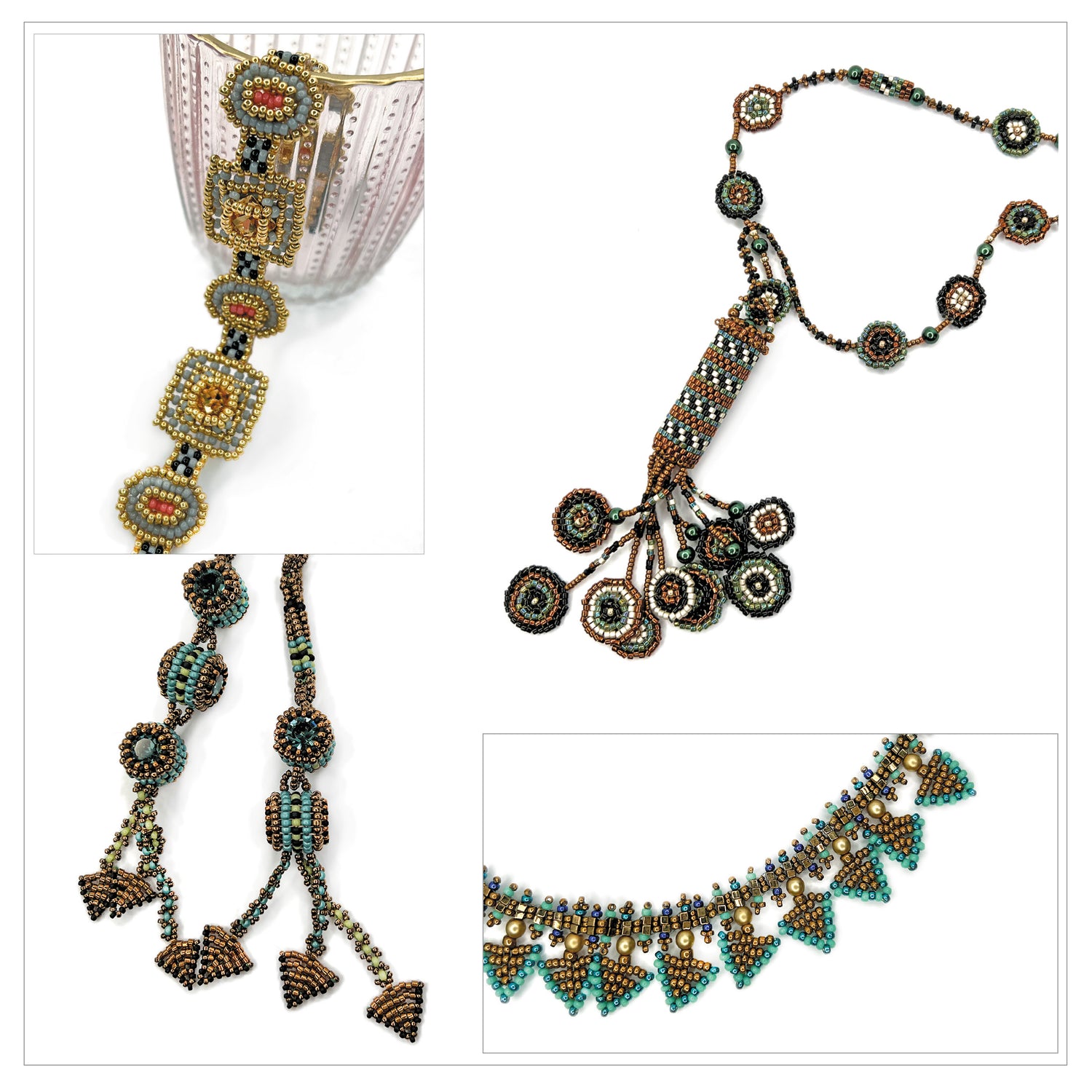 The LilyBeth design series started as an introduction to bezelled cabochons and mixed bead shapes to ‘grow’ a bracelet. It returned as a double sided pendant, and now, by popular request, is back as an even more elaborate, double sided Gothic extravaganza. As well as the basic LilyBeth motif, we cover how to create and link the double sided shapes; and how to adapt the design to make beaded beads and tassels. For students prefering not to work a Cross shape, the design can be worked as a gorgeous lariat.