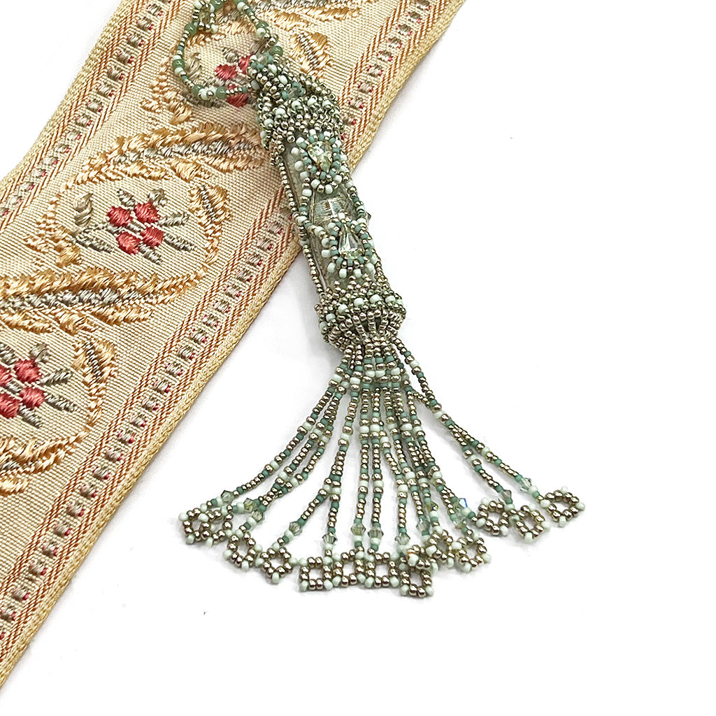 A gorgeously multi layered tassel pendant. Inspired by the Passementerie of Venice, discovered in a store where time seems to stand still. Katia is a pendant is full of lavish detail. With intriguing double layer Chaton bezels, encasing a tassel of lavish fringing. A sweet necklace strap is worked in size 15 seed beads and interspersed with crystal beaded beads.