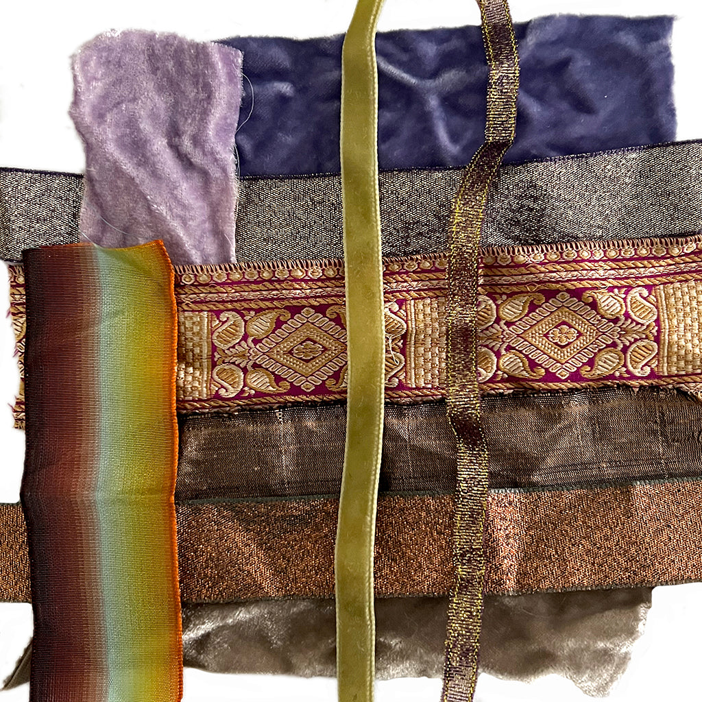 I love colour and it has been a pleasure to sort through and make some lavish and enticing colour inspiration for you. Each treasure box is a thoughtfully collated mix of seed beads, accents, cabochons, crystals, vintage silks, ribbons and velvets. Each is one of a kind, ensuring your creation will be unique and gorgeous. I’ve taken care of the basics too, with a piece of beading foundation and my favourite metallic paper leather for backing your work.