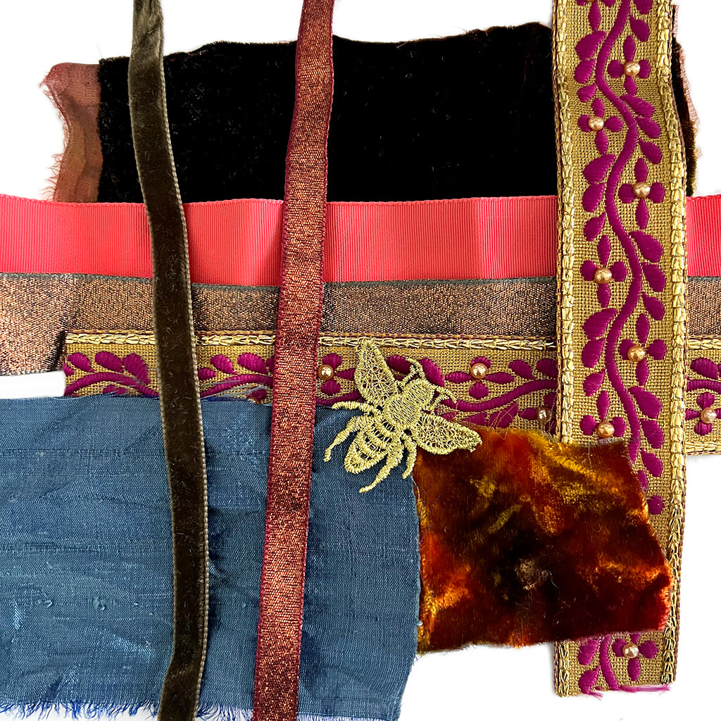 I love colour and it has been a pleasure to sort through and make some lavish and enticing colour inspiration for you. Each treasure box is a thoughtfully collated mix of seed beads, accents, cabochons, crystals, vintage silks, ribbons and velvets. Each is one of a kind, ensuring your creation will be unique and gorgeous. I’ve taken care of the basics too, with a piece of beading foundation and my favourite metallic paper leather for backing your work.