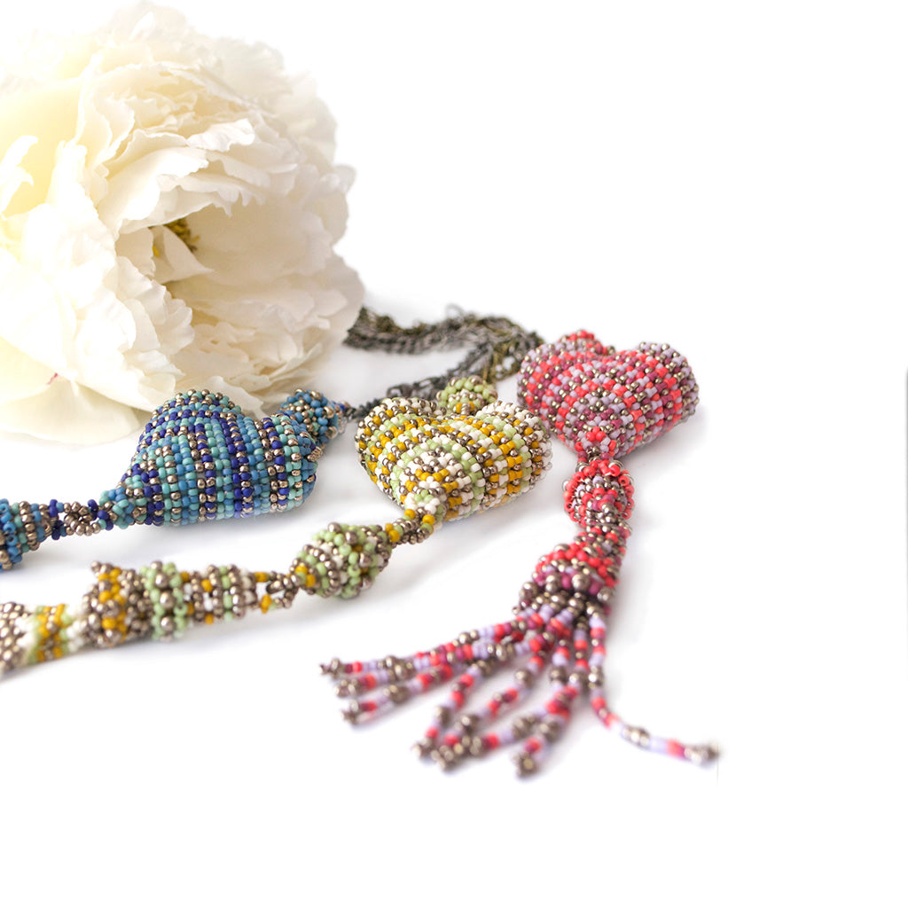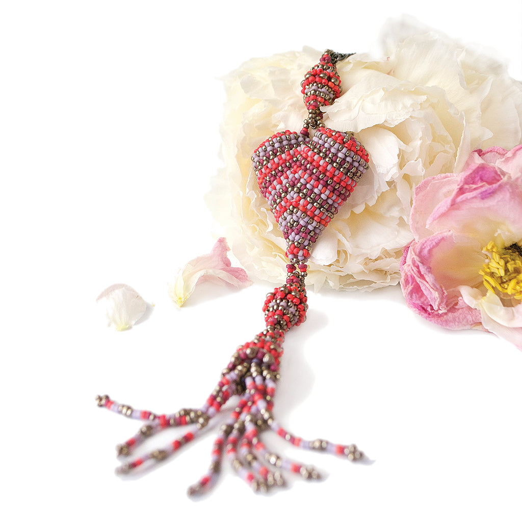 Beloved is a three dimensional padded heart shaped pendant with beaded beads and a tassel, worked in Albion stitch it's a design suitable for all beaders who have mastered basic thread Tension.